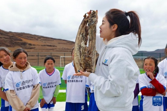 圖為四川籍的中國(guó)女足國(guó)腳萬(wàn)佳瑤(前)獲贈(zèng)瓦吾小學(xué)女足球隊(duì)員從家里帶來的臘肉(2023年3月3日攝)。