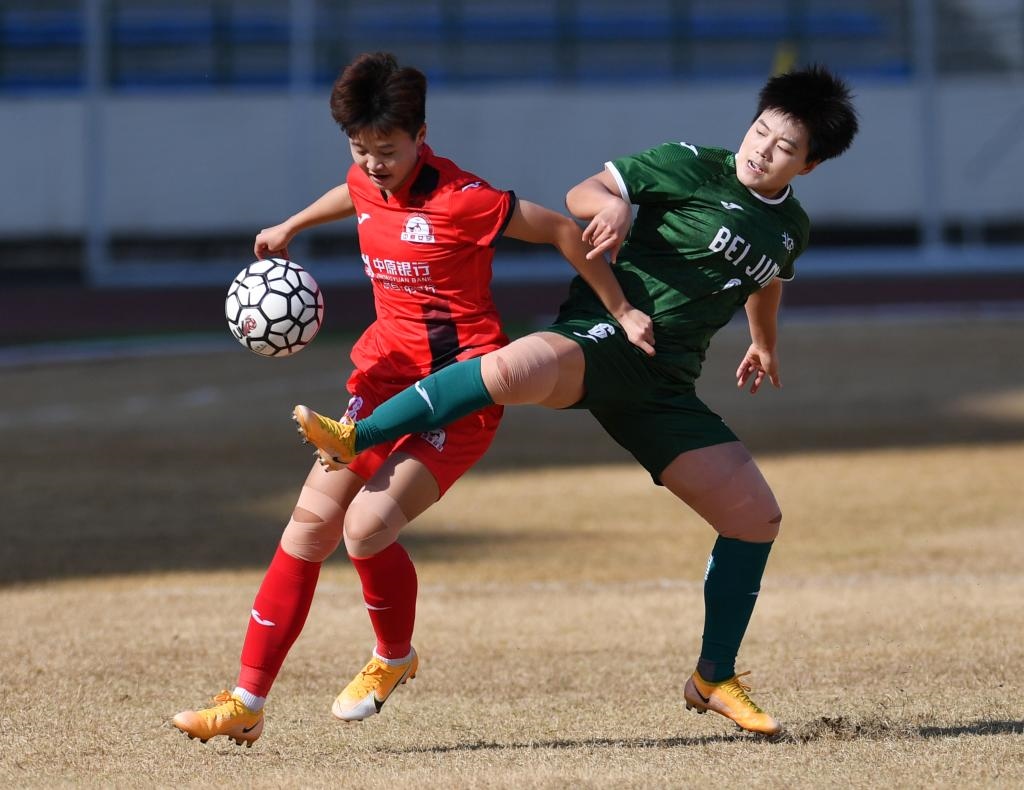 3月4日,北京女足隊(duì)球員馬曉蘭(右)與河南中原女足隊(duì)球員樊夢霏在比賽中拼搶。新華社記者 李嘉南 攝
