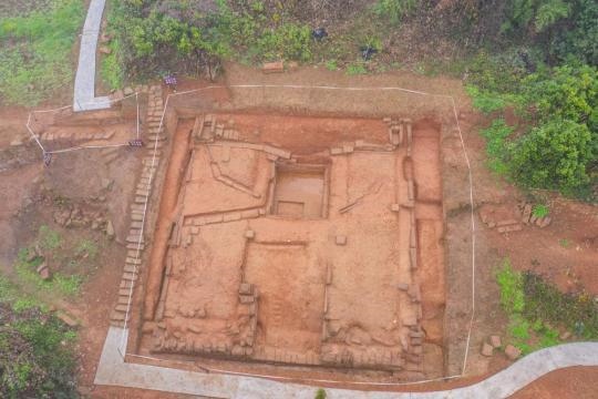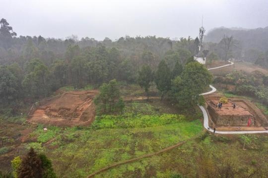 這是2月9日在重慶合川釣魚(yú)城遺址拍攝的新發(fā)掘出的類似闕臺(tái)建筑的基址(無(wú)人機(jī)照片)。新華社記者 黃偉 攝