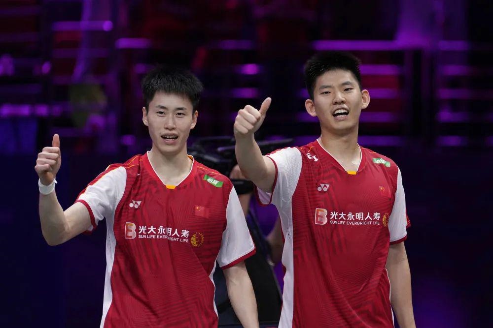 5月20日,中國隊組合劉雨辰/歐烜屹(右)在男雙比賽后慶祝。