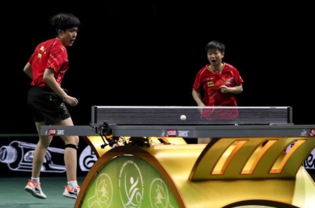 王楚欽(左)/孫穎莎在比賽中慶祝得分。