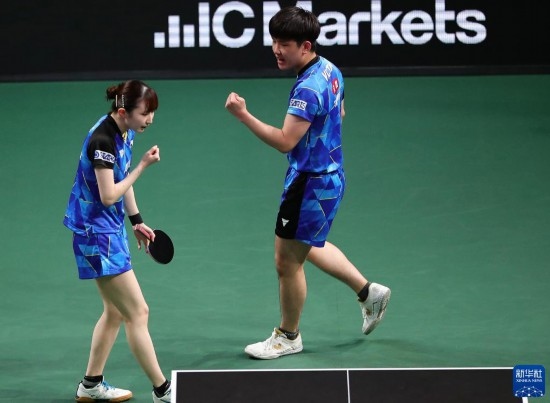 5月26日,張本智和(右)/早田希娜在比賽中慶祝。