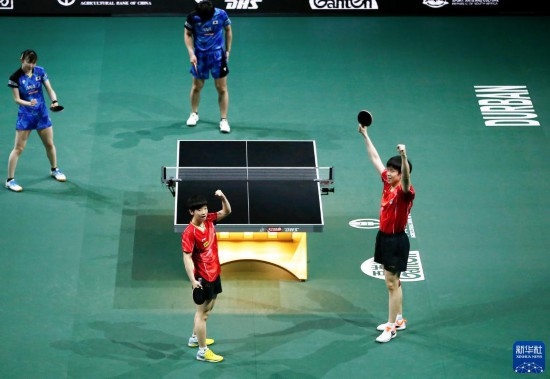 5月26日,王楚欽(右)/孫穎莎在比賽中慶祝