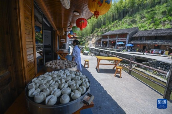 5月30日,布袋坑村的村民把剛蒸好的布袋山饅頭擺出來(lái)攤涼。