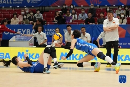 6月2日,中國隊(duì)球員袁心玥(右)在比賽中救球。新華社記者 張笑宇 攝