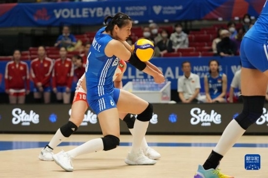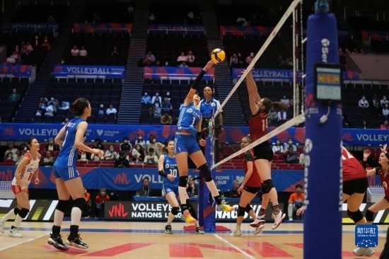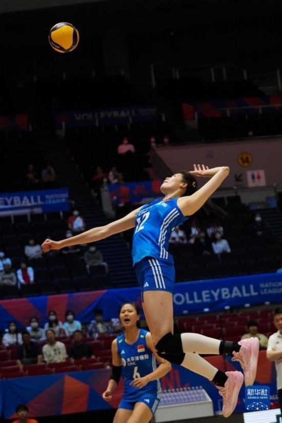 6月2日,中國隊(duì)球員袁心玥(中)在比賽中扣球。新華社記者 張笑宇 攝