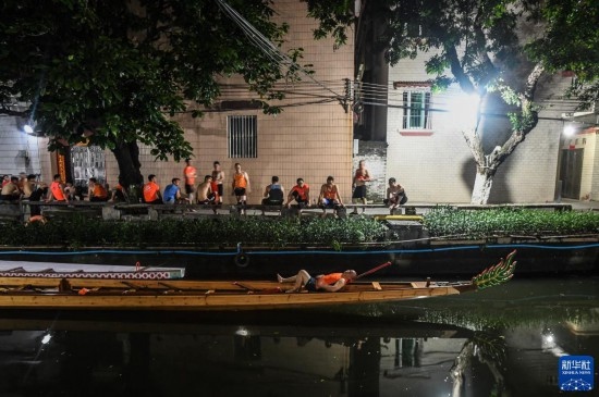 佛山疊滘東勝村的“扒仔”(槳手)在端午前堅(jiān)持每天夜晚訓(xùn)練,以求能在端午龍船漂移賽中展示最佳狀態(tài)(6月16日攝)。