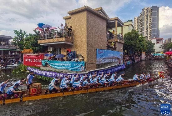 這是佛山疊滘端午龍船漂移賽開始前的龍船巡游(6月22日攝)。