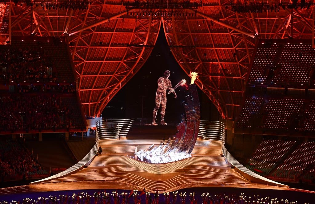 承載著全世界億萬人熱情的“數(shù)字火炬手”跨越壯闊的錢塘江,來到杭州奧體中心體育場上空,奔向主火炬塔。19根機械柱緩緩立起,“數(shù)字火炬手”與現(xiàn)場最后一棒火炬手汪順共同點燃主火炬塔。亞運史上首個“數(shù)實融合”點火儀式帶給觀眾全新的體驗。