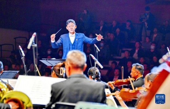 指揮普布次仁指揮樂(lè)隊(duì)演奏《我的祖國(guó)》(7月18日攝)。