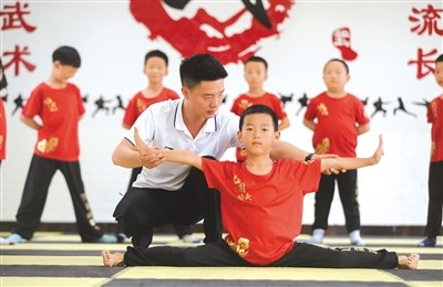 暑假期間,貴州省貴陽市開陽縣青少年學(xué)生校外活動中心免費(fèi)開辦少兒武術(shù)班,吸引當(dāng)?shù)貝酆梦湫g(shù)的孩子參加學(xué)習(xí)。圖為7月18日,在少兒武術(shù)班,孩子們在老師的指導(dǎo)下練習(xí)武術(shù)動作。袁福洪攝(人民圖片)