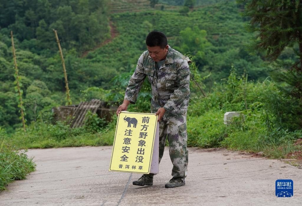 一名監(jiān)測員在野象活動(dòng)區(qū)域一處道路上設(shè)置警示牌(7月19日攝)。