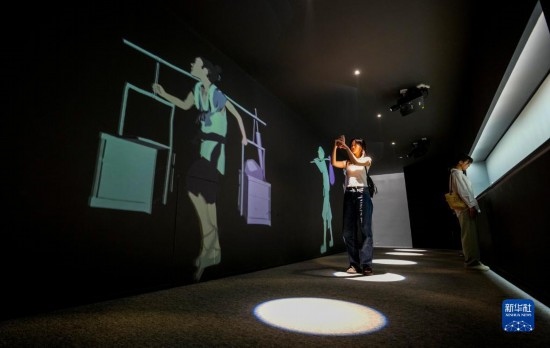 7月31日,演員在《畫游清明上河――故宮沉浸藝術(shù)展》孫羊店全沉浸光影空間內(nèi)展示宋朝時(shí)期的文化生活。
