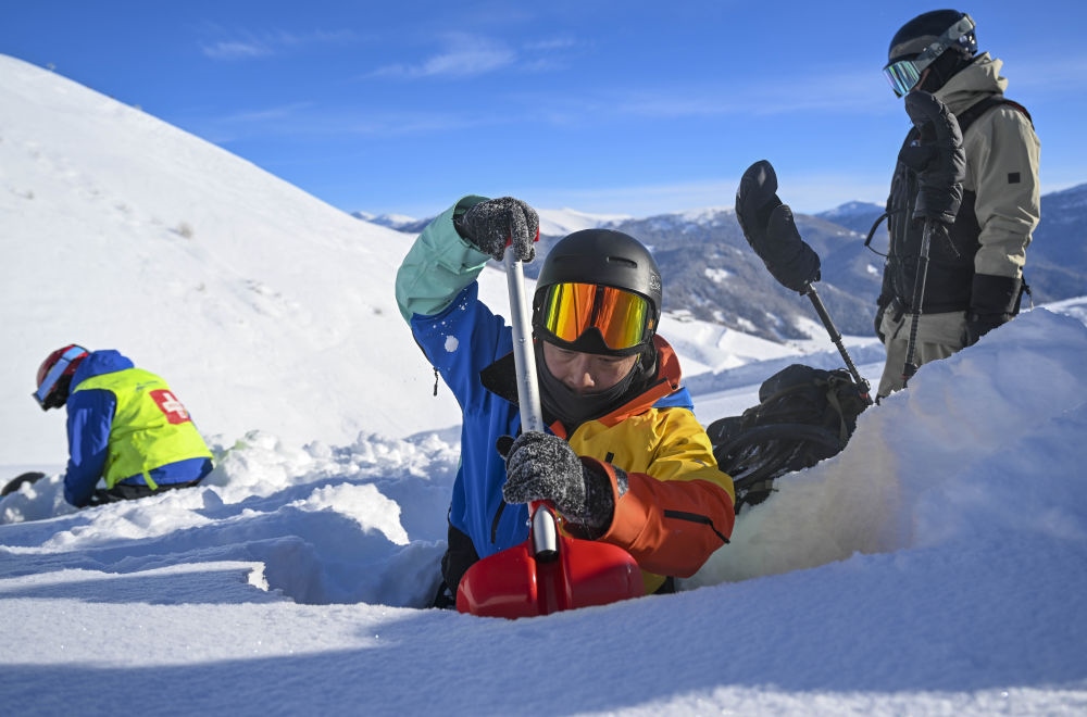 彭超(中)和新疆阿勒泰地區(qū)禾木吉克普林滑雪場救援隊(duì)一起做雪層分析,預(yù)判風(fēng)險(xiǎn)保障游客滑行安全。
