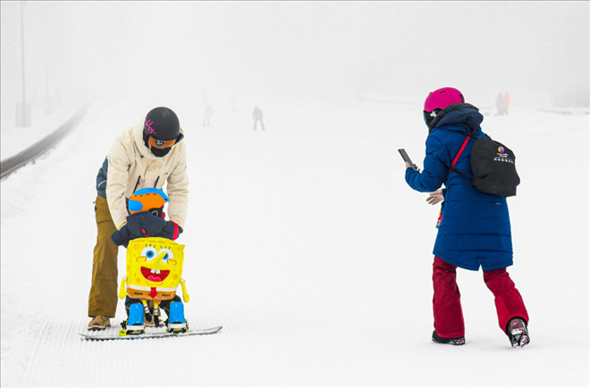 在新疆白云國際滑雪場,許秀娟(右)在給愛人和兒子拍照。哈爾濱人許秀娟曾是專業(yè)運(yùn)動員,代表國家隊(duì)拿過國際大賽獎牌。退役后她來到新疆,在這里她和愛人相識,一起開辦培訓(xùn)機(jī)構(gòu),面向青少年推廣冰雪運(yùn)動。