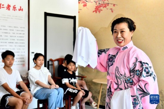 8月9日,在棗莊市市中區(qū)龍山路街道辛莊社區(qū),棗莊市藝術(shù)劇院柳琴戲市級非遺傳承人郭曉玲在指導(dǎo)孩子學(xué)習(xí)柳琴戲。