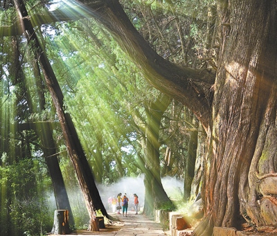 漫步在翠云廊蜿蜒的古道石板路上,松柏木的清香縈繞鼻尖,縷縷陽光穿透樹蔭,側(cè)耳傾聽風(fēng)拂樹干的聲音——一步一行中,收獲一段愜意時(shí)光。