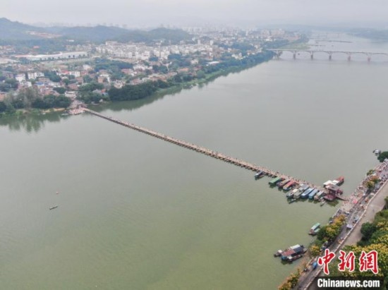 圖為10月2日,航拍橫臥于貢江之上的贛州東河浮橋。東河浮橋始建于南宋乾道年間,距今已有800多年歷史,該浮橋全長約400米,連接贛州主城區(qū)和對岸的水東鎮(zhèn),方便著兩岸民眾的出行。劉力鑫 攝