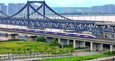 10月3日,亞運(yùn)涂裝復(fù)興號(hào)智能動(dòng)車組從杭州東站發(fā)出,穿過錢塘江。本報(bào)記者 陳城攝/光明圖片