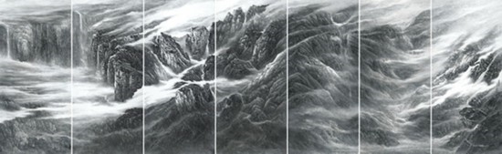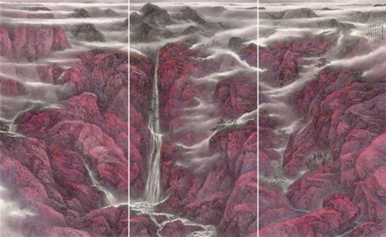 且看樂震文的《直上浮云》《云卷云舒》和《黃土馳風(fēng),日月星辰》,那逶迤茫茫的群山峻嶺,那縱橫畫面的云蒸霞蔚,那連綿不絕的箭樓城堞,哪里還是傳統(tǒng)文人山水畫的淡煙輕嵐,縹緲冷逸?濃縮于畫內(nèi)的精神意蘊,分明凸顯了現(xiàn)代山水畫對家國情懷的抒發(fā)。且讀張弛的《云起疊嶂》《惟余莽莽》和《紫氣氤氳》,那天光紫氣的浩渺煙云,那渾然一體的山水氣象,那千回百轉(zhuǎn)的流水飛泉,其實早已脫離了對自然山水的寫照,而是她感悟的時代精神在偌大畫面上的縱橫揮寫、主觀臆造。