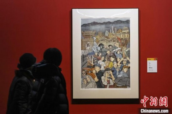 觀眾在江蘇省美術(shù)館展廳內(nèi)欣賞展出的版畫(huà)作品。 中新網(wǎng)記者 泱波 攝