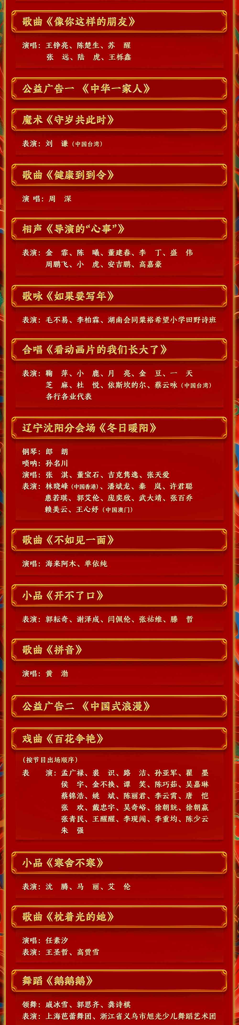 整臺晚會堅持“歡樂吉祥、喜氣洋洋”的總目標,涵蓋歌曲、舞蹈、相聲、小品、戲曲、武術(shù)、魔術(shù)、雜技、音樂劇、微電影等各類型節(jié)目,為全球華人奉上一道平實、喜慶、優(yōu)美的“文化大餐”。