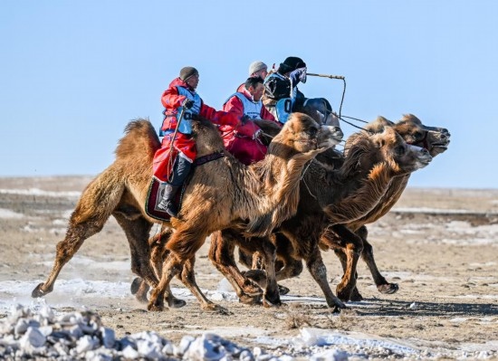 牧民畢力格圖看賽車比賽過足了眼癮,在參加完賽駱駝比賽后得出一個結(jié)論:“駱駝就相當于牧民的越野車,騎著駱駝在雪原中奔跑,比賽車還刺激。”