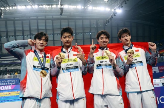 2月11日,中國隊(duì)選手王浩宇、張展碩、季新杰和潘展樂(從左到右)在頒獎(jiǎng)儀式后合影慶祝。新華社記者 雒圓 攝