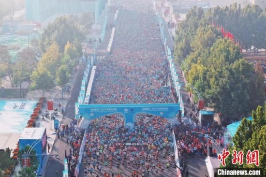 2023年10月15日,2023天津馬拉松鳴槍開跑,參加半馬的選手從起點(diǎn)出發(fā)。(無(wú)人機(jī)照片) 佟郁 攝