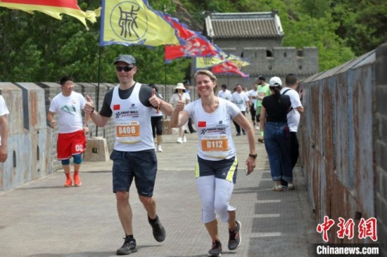 2023年5月21日,黃崖關(guān)長(zhǎng)城國(guó)際馬拉松賽在天津市薊州區(qū)鳴槍開跑。圖為國(guó)外選手在比賽中穿越黃崖關(guān)長(zhǎng)城。張彥 攝