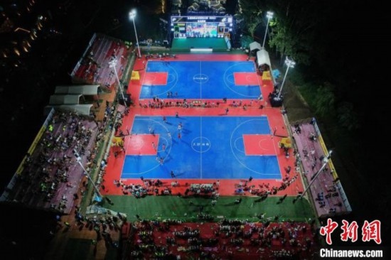2023年8月2日晚,全國(guó)和美鄉(xiāng)村籃球大賽(村BA)東北賽區(qū)揭幕戰(zhàn)在天津市薊州區(qū)郭家溝村開賽。(無(wú)人機(jī)照片) 佟郁 攝