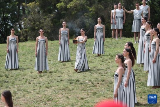 4月16日,扮演最高女祭司的演員瑪麗·米娜(中)在儀式上手捧火種罐。新華社記者趙丁喆攝