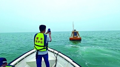 廣西合浦儒艮國家級自然保護區(qū)工作人員檢查海洋哺乳動物水下聲學監(jiān)測浮標。
