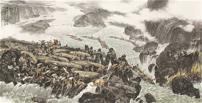 興修水利工程,在防汛抗旱的同時以囤水積水助力農(nóng)田灌溉,是綿延千年的治水智慧。中國古代水利工程中,都江堰水利工程尤具代表性。它是世界灌溉工程遺產(chǎn),也是當(dāng)今世界年代久遠(yuǎn)、唯一留存、以無壩引水為特征的宏大水利工程。中國畫名家宗其香于上世紀(jì)五六十年代繪制的《修筑都江堰》,便著重刻畫了戰(zhàn)國時期秦國蜀郡太守李冰親臨實地、督造江堤的場景,畫風(fēng)樸實,歷史感撲面而來。入選“中華文明歷史題材美術(shù)創(chuàng)作工程”,由梁時民、李錛、張躍進合作的中國畫《李冰父子與都江堰》,則以俯瞰視角展現(xiàn)了宏偉壯闊、蕩氣回腸的都江堰修建場面。畫面中,岷江洶涌,山石崢嶸;魚嘴筑堰,寶瓶分流;燒山碎石、河道清理、石料運送等原屬不同時空的場景并置出現(xiàn),充滿浪漫主義色彩。這兩件畫作,將古人因勢利導(dǎo)改造水流的治水智慧具象化,充分彰顯都江堰讓成都平原由“澤國”變?yōu)椤疤旄畤钡臍v史意義。