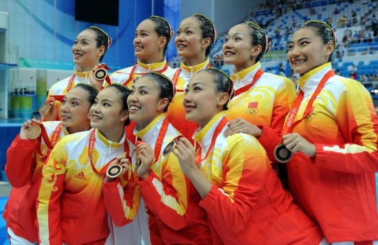 2008年8月23日,中國隊隊員在領(lǐng)獎臺上展示獎牌。當(dāng)日,在國家游泳中心——“水立方”舉行的北京奧運會花樣游泳集體自由自選決賽中,中國隊以97.500分的總成績獲得該項目銅牌。新華社記者 王定昶 攝