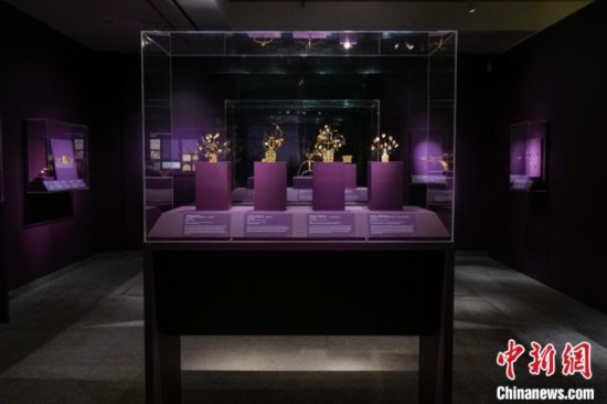 當?shù)貢r間9月4日,百余件遼寧三燕文物亮相紐約華美協(xié)進社中國美術館秋季特展《龍城之金:遼寧三燕文物選萃,337-436》。圖為展覽現(xiàn)場的金步搖。 中新社記者 王帆 攝