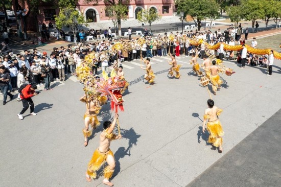 10月16日,中建深裝施工人員在深圳市體育中心專業(yè)足球場(chǎng)屋頂?shù)跹b幕墻材料(無(wú)人機(jī)照片)。