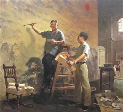 正在舉辦的第十四屆全國美術(shù)作品展覽進(jìn)京作品展上,撲面而來的藝術(shù)形象是腳踏中華大地的各族人民,是中國近現(xiàn)代文化史上的先賢圣哲,是和我們一道相擁而立的堂堂中國人。這些形象剛強(qiáng)勇毅,如潮如云,傳遞著眾志成城的精神力量,扣動人心。譬如,呂鵬《山河頌》,以濃郁的色調(diào),再現(xiàn)傅抱石、關(guān)山月兩位前輩創(chuàng)作《江山如此多嬌》的情景,鐫刻新中國美術(shù)史上重要一幕;鄔大勇《我心中的英雄》塑造了畫家少年時代的英雄偶像——錢學(xué)森等一代科學(xué)家。還有許多氣勢宏大的創(chuàng)作,它們既是社會生活、時代精神的藝術(shù)載體,又是美術(shù)工作者面對歷史、面對人民的激情熔爐。這些作品以人民形象為根基,深植時代沃土,構(gòu)成歷史與現(xiàn)實相輝映的史詩畫卷。