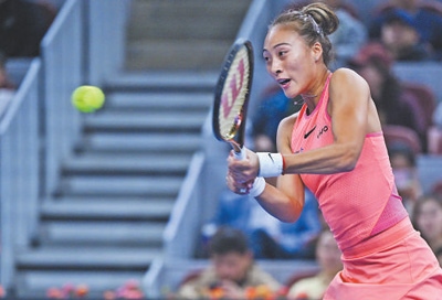 2024年中國網(wǎng)球公開賽女單1/4決賽,中國球員鄭欽文在比賽中回球。新華社記者 張 龍攝