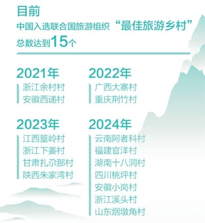 北京時間11月15日,在哥倫比亞卡塔赫納舉行的聯(lián)合國旅游組織執(zhí)行委員會第122次會議上,公布了2024年“最佳旅游鄉(xiāng)村”名單。我國申報的云南阿者科村、福建官洋村、湖南十八洞村、四川桃坪村、安徽小崗村、浙江溪頭村、山東煙墩角村7個鄉(xiāng)村入選,是本屆入選鄉(xiāng)村數(shù)量最多的國家。至此,我國的“最佳旅游鄉(xiāng)村”總數(shù)達(dá)到15個,居世界第一。