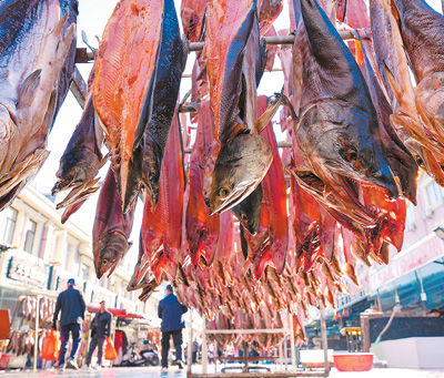 冬季的東極魚市,不僅能購買到種類繁多的冷水魚類制品,還可領(lǐng)略“萬物皆可凍”的東北民俗。因此,這里也成為游客來到撫遠后必去的“打卡地”。