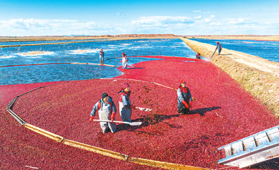 在撫遠蔓越莓種植基地,工人正在收獲成熟的蔓越莓。