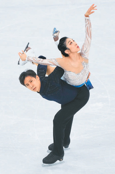 北京冬奧會(huì)上,中國(guó)花樣滑冰選手隋文靜與韓聰在比賽中。