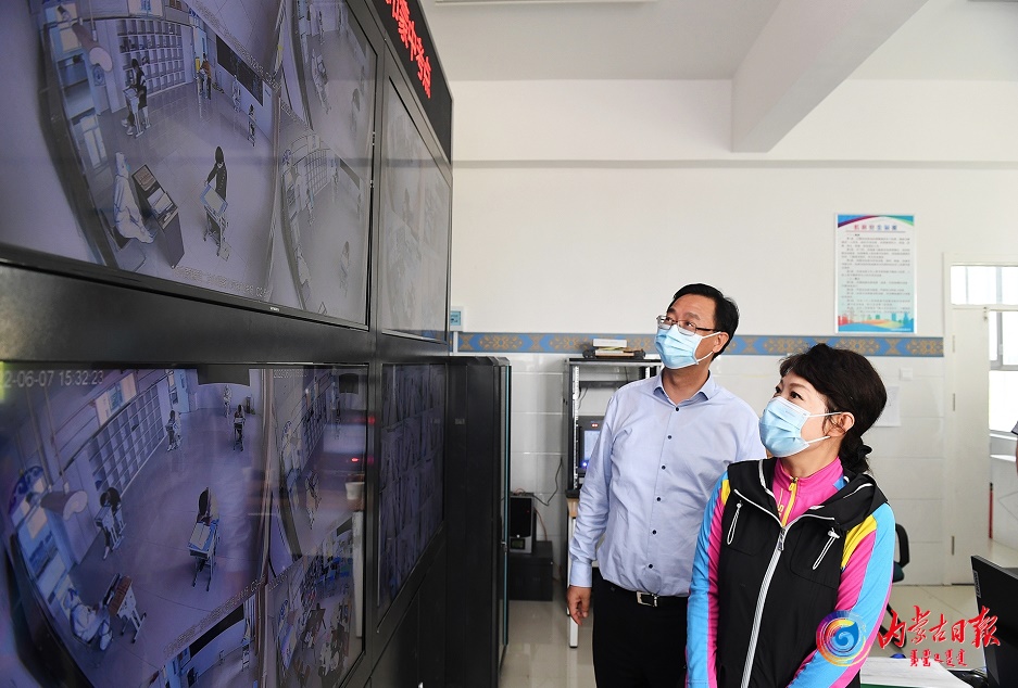 6月7日,王莉霞在二連浩特市蒙古族中學通過視頻監(jiān)控查看學生高考實時畫面,詳細了解考點疫情防控部署。內(nèi)蒙古日報社融媒體記者韓卿立攝