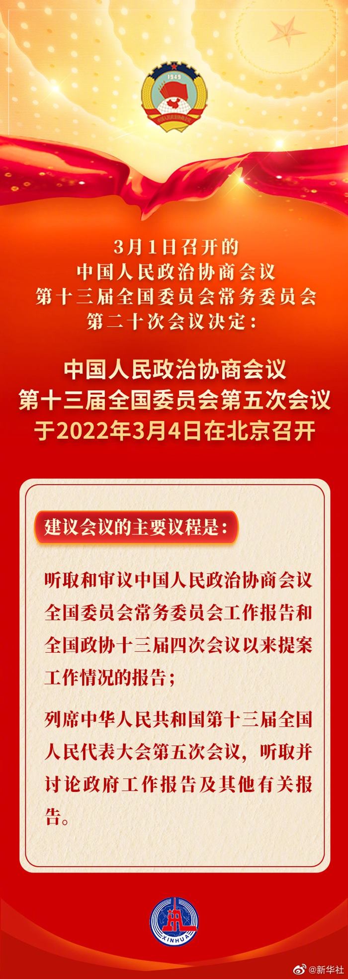 3月1日召開的中國人民政治協(xié)商會議第十三屆全國委員會常務委員會第二十次會議決定:中國人民政治協(xié)商會議第十三屆全國委員會第五次會議于2022年3月4日在北京召開。建議會議的主要議程是:聽取和審議中國人民政治協(xié)商會議全國委員會常務委員會工作報告和全國政協(xié)十三屆四次會議以來提案工作情況的報告;列席中華人民共和國第十三屆全國人民代表大會第五次會議,聽取并討論政府工作報告及其他有關報告。