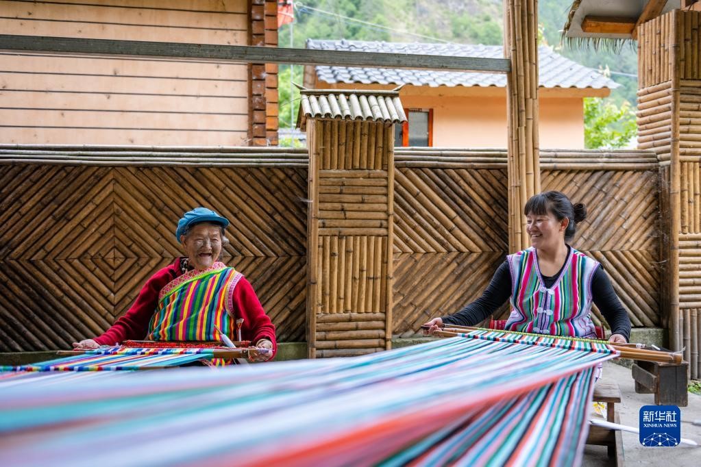 在云南省貢山獨(dú)龍族怒族自治縣獨(dú)龍江鄉(xiāng)迪政當(dāng)村,獨(dú)龍族老人李文仕(左)和女兒在編織獨(dú)龍?zhí)?5月10日攝)。新華社記者 曹夢(mèng)瑤 攝