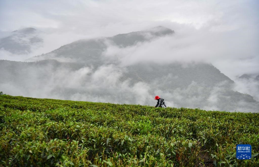西藏林芝市墨脫縣德興鄉(xiāng)荷扎村村民貢桑拉姆在采茶(4月16日攝)。新華社記者 晉美多吉 攝