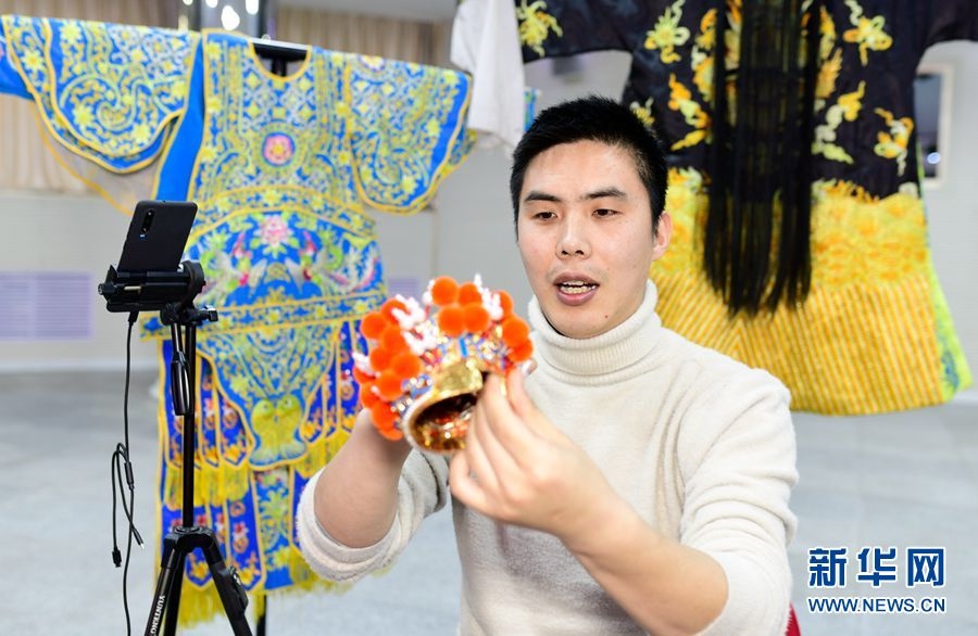 4月19日,內(nèi)蒙古婦女兒童中心少兒京劇班教師崔猛通過網(wǎng)絡(luò)直播平臺為學生介紹戲曲工藝品制作技藝。 -