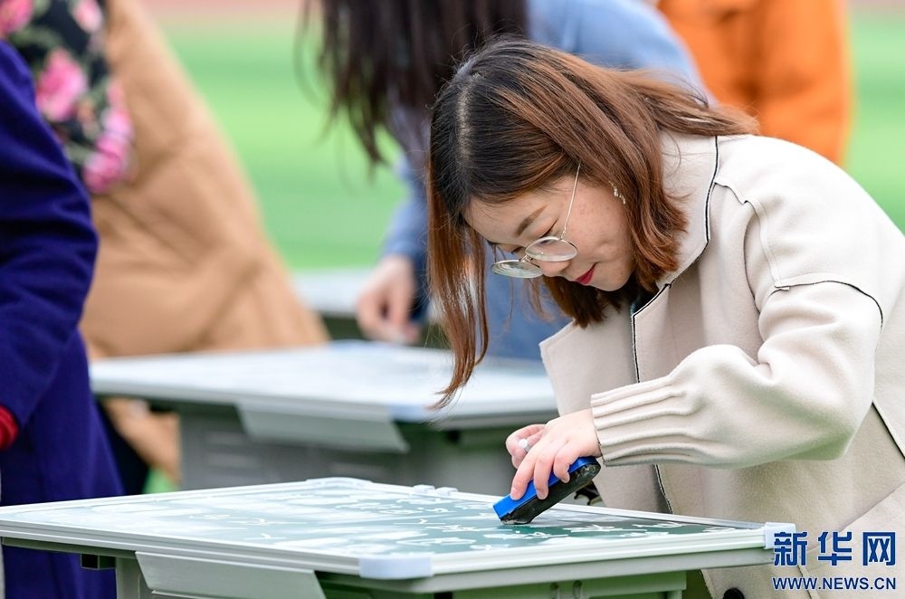 3月8日,呼和浩特市第三十八中學(xué)教師在板書(shū)比賽中。新華網(wǎng)發(fā)(王正 攝)